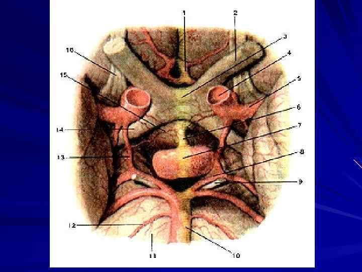 1 -внутренние мозговые вены; 2 -третий желудочек; 3 -эпифиз; 4 -большая вена мозга; 5 -сосудистое сплетение бокового желудочка; 6 -таламус; 7 -столбы свода мозга.