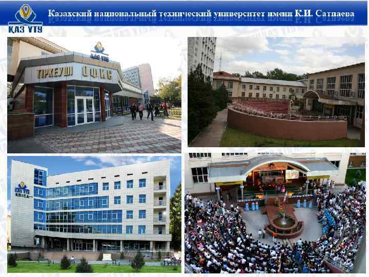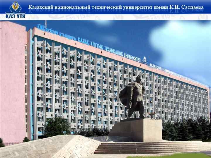 ОСНОВНЫЕ ЭТАПЫ РАЗВИТИЯ Каз. НТУ ИМЕНИ К. И. САТПАЕВА § 1934 год – осуществлен первый набор студентов Казахского горно-металлургического института (КГМИ); § 1960 год – КГМИ переименован в Казахский политехнический институт (Каз. ПТИ); § 1994 год – Каз. ПТИ имени В. И. Ленина переименован в Казахский национальный технический университет (Каз. НТУ); § 1999 год – Каз. НТУ присвоено имя Каныша Имантаевича Сатпаева § 2001 год – Указом Президента Республики Казахстан университету присвоен особый статус.
