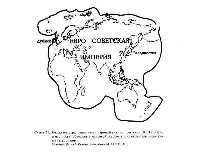 Жан-Франсуа Тириар(1922 -1992) бельгийский геополитик, Считал, что масштаб Европы недостаточен для того, чтобы освободиться от американской гегемонии. Следовательно, главным условием «европейского освобождения» является объединение Европы с СССР. При этом Тириар пришел к радикальному выводу о том, что для Европы лучше выбрать советский социализм, чем англосаксонский капитализм[13]. С начала 80 -х Жан Тириар выступает в амплуа идеолога «Третьего пути» . В своих работах он ратует за создание единого евразийского государства «от Исландии до Тихого океана» , которое должно быть светским, унитарным государством централизованного типа, опирающемся на гражданскую нацию. По Тириару, «существование бесклассового общества может быть гарантировано лишь сверхмощью Государства» [14]. Претерпевшие изменения идеи Тириара были изложены в книге «Евро-советская империя от Владивостока до Дублина» , вышедшей в 1984 году. (См. схему)