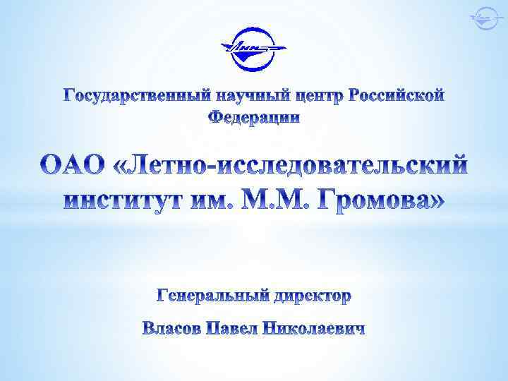 СТРУКТУРА ИНСТИТУТА ОАО «Летноисследовательский институт им. М. М. Громова» Научноисследовательский центр (НИЦ) Летноиспытательный центр (ЛИЦ) Школа летчиковиспытателей (ШЛИ) Служба главного инженера (СГИ) Подразделения управления и обслуживания Подразделения социальной сферы