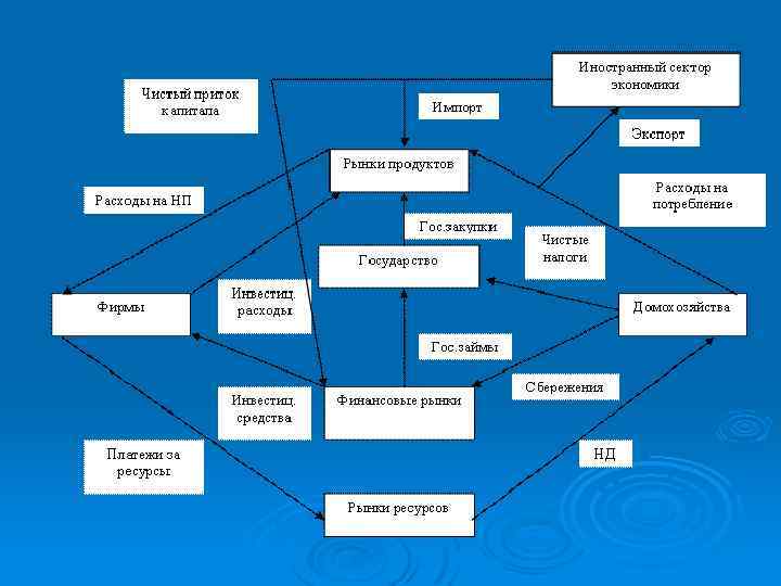 Иностранный сектор связан с экономической системой 3 способами: импорт, экспорт и чистый приток капитала: Импорт отражает платежи за импортируемые данной страной товары и услуги. Ø Экспорт отражает платежи данной стране. Разница между экспортом и импортом называется чистым экспортом. Ø Международные финансовые операции: получение или предоставление кредитов, сделки по купле-продаже реальных и финансовых активов. Ø НП = Расходы на потребление + Расходы на инвестиции + Госзакупки + Экспорт – Импорт = Потребление + Сбережения + Чистые налоги + чистый экспорт= НД.