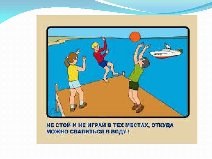 Правила безопасного поведения на воде: Не заплывать за буйки. Не хватать друга за руки и ноги во время игр на воде. Не умеющим плавать купаться в нарукавниках, кругах и других помогающих плавательных приспособлениях.