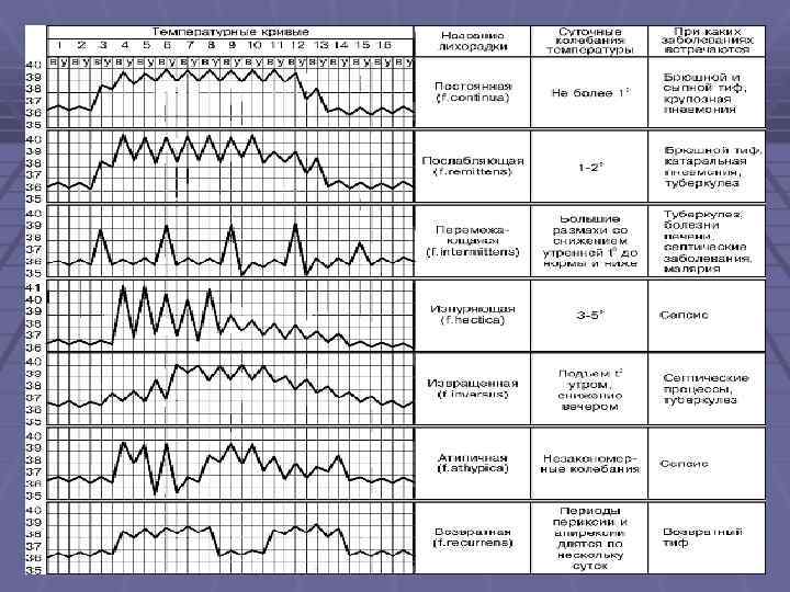 По характеру колебаний температуры в течение суток § постоянная (суточные колебания не более 1 о. С) – брюшной тиф; § послабляющая или ремиттирующая (суточные колебания более 1 о. С), § § обычно 2 -2, 5 о. С – при гнойных заболеванях; гектическая или истощающая (большие суточные размахи до 3 -5 о. С со снижением температуры тела до нормы или ниже нормы) – при сепсисе; перемежающая или интермиттирующая (чередование лихорадочных приступов и периодов нормальной температуры) – малярия; волнообразная или ундулирующая (постепенное нарастание температуры изо дня в день до высоких значений с последующим снижением ее и повторным формированием новых волн) – бруцеллез; извращенная или инвертированная (более высокая утренняя температура по сравнению с вечерней) – туберкулез;