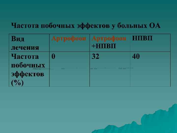 Преимущества АРТРОФООНА АРТРОФООН по противовоспалительной активности не уступает НПВП при курсовом приеме. u АРТРОФООН может применяться с другими препаратами для усиления их эффекта и более быстрого достижения ремиссии. u АРТРОФООН сокращает потребность в других противовоспалительных средствах u АРТРОФООН не имеет серьезных побочных эффектов: u Прием Артрофоона рекомендуется при: При необходимости длительного курсового лечения. u При любой непереносимости НПВП. u