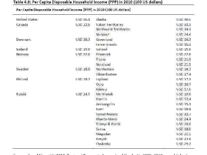 Количественные соотношения трех арктик Арктика Европы Арктика Азии Число регионов Число стран Площадь, тыс. кв. км Население, тыс. чел. Динамика численности населения 15 5 3009, 8 2851, 0 Стабилизация 4 1 2586, 4 855, 4 Быстрое сокращение Уровень среднего и выше образования Валовой продукт, млрд. долл. США. 2010 по ППС Полюса подушевого располагаемого дохода тыс. долл. на человека 2010 г. Полюса подушевого ВРП, тыс. долл. 2010 Максимальный Средний . 4 2 5707, 0 778, 5 Естественный и общий прирост на 1000 чел. населения больше, чем в США и Канаде Минимальный 141, 627 88, 2 54, 981 15, 0 Исландия 22, 0 Финнмарк 18, 0 Республика Саха (Якутия) 32, 7 Ямало-Ненецкий автономный округ 19, 1 Таймырский муниципальный район 60, 1 Чукотский автономный округ Максимальная доля добычных (ресурсных) производств 24, 6 Нунавут 40, 6 Аляска 21, 0 Архангельская область 45, 1 Норботтен Особенность структуры Максимальная доля ВРП перерабатывающих производств Арктика Америки 45, 9 Нунавут 86, 7 Северо-Западные Территории Максимальная доля сервисных производств (сектор услуг)