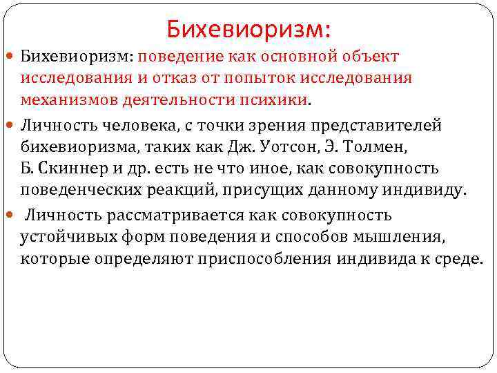 Бихевиоризм: поведение как основной объект исследования и отказ от попыток исследования механизмов деятельности психики. Личность человека, с точки зрения представителей бихевиоризма, таких как Дж. Уотсон, Э. Толмен, Б. Скиннер и др. есть не что иное, как совокупность поведенческих реакций, присущих данному индивиду. Личность рассматривается как совокупность устойчивых форм поведения и способов мышления, которые определяют приспособления индивида к среде.