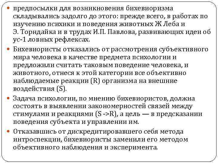предпосылки для возникновения бихевиоризма складывались задолго до этого: прежде всего, в работах по изучению психики и поведения животных Ж Леба и Э. Торндайка и в трудах И. П. Павлова, развивающих идеи об ус-1 ловных рефлексах. Бихевиористы отказались от рассмотрения субъективного мира человека в качестве предмета психологии и предложили считать таковым поведение человека, и животного, отнеся к этой категории все объективно наблюдаемые реакции (R) организма на внешние воздействия (S). Задача психологии, по мнению бихевиористов, должна состоять в выявлении закономерностей связей между стимулами и реакциями (S ->R), а цель — в предсказании поведения субъекта и управлении им. Отказавшись от дискредитировавшего себя метода интроспекции, бихевиористы заменили его методом объективного наблюдения и эксперимента.