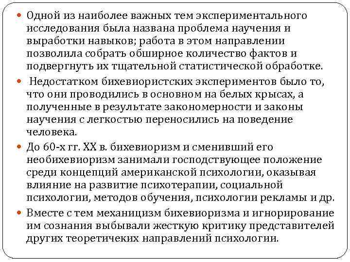 Одной из наиболее важных тем экспериментального исследования была названа проблема научения и выработки навыков; работа в этом направлении позволила собрать обширное количество фактов и подвергнуть их тщательной статистической обработке. Недостатком бихевиористских экспериментов было то, что они проводились в основном на белых крысах, а полученные в результате закономерности и законы научения с легкостью переносились на поведение человека. До 60 -х гг. XX в. бихевиоризм и сменивший его необихевиоризм занимали господствующее положение среди концепций американской психологии, оказывая влияние на развитие психотерапии, социальной психологии, методов обучения, психологии рекламы и др. Вместе с тем механицизм бихевиоризма и игнорирование им сознания выбывали жесткую критику представителей других теоретичеких направлений психологии.