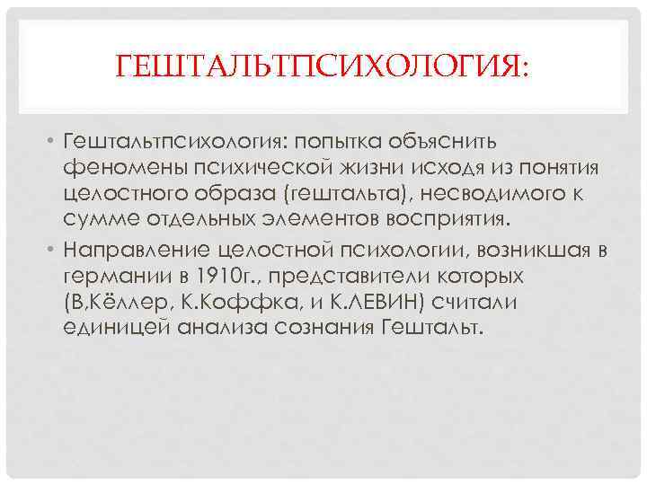 ГЕШТАЛЬТПСИХОЛОГИЯ: • Гештальтпсихология: попытка объяснить феномены психической жизни исходя из понятия целостного образа (гештальта), несводимого к сумме отдельных элементов восприятия. • Направление целостной психологии, возникшая в германии в 1910 г. , представители которых (В, Кёллер, К. Коффка, и К. ЛЕВИН) считали единицей анализа сознания Гештальт.