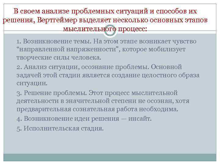 В своем анализе проблемных ситуаций и способов их решения, Вертгеймер выделяет несколько основных этапов мыслительного процесс: 1. Возникновение темы. На этом этапе возникает чувство “направленной напряженности”, которое мобилизует творческие силы человека. 2. Анализ ситуации, осознание проблемы. Основной задачей этой стадии является создание целостного образа ситуации. 3. Решение проблемы. Этот процесс мыслительной деятельности в значительной степени не осознан, хотя предварительная сознательная работа необходима. 4. Возникновение идеи решения — инсайт. 5. Исполнительская стадия.