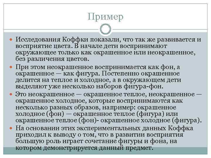 Пример Исследования Коффки показали, что так же развивается и восприятие цвета. В начале дети воспринимают окружающее только как окрашенное или неокрашенное, без различения цветов. При этом неокрашенное воспринимается как фон, а окрашенное — как фигура. Постепенно окрашенное делится на теплое и холодное, а в окружающем дети выделяют уже несколько наборов фигура-фон. Это неокрашенное — окрашенное теплое, неокрашенное — окрашенное холодное, которые воспринимаются как несколько разных образов, например: окрашенное холодное (фон) — окрашенное теплое (фигура) или окрашенное теплое (фон)- окрашенное холодное (фигура). На основании этих экспериментальных данных Коффка приходил к выводу о том, что в развитии восприятия большую роль играет сочетание фигуры и фона, на котором демонстрируется данный предмет.