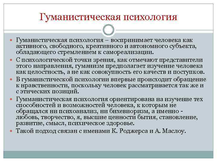 Гуманистическая психология – воспринимает человека как активного, свободного, креативного и автономного субъекта, обладающего стремлением к самореализации. С психологической точки зрения, как отмечают представители этого направления, гуманизм предполагает изучение человека как целостность, а не как совокупность его качеств и поступков. В гуманистической психологии впервые происходит обращение к нравственности, поскольку человек рассматривается так же и с этических позиций. Гумманистическая психология ориентирована на изучение тех способностей и возможностей человека, к которым не обращался ни психоанализ, ни бихевиоризм, а именно любовь, творчество, я, высшие ценности бытия, становление, развитие, смысл, психическое здоровье. Такой подход связан с именами К. Роджерса и А. Маслоу.