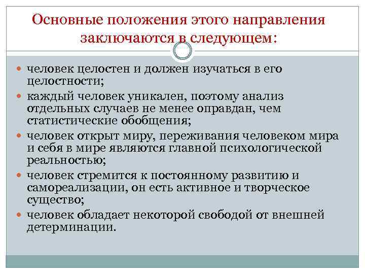 Основные положения этого направления заключаются в следующем: человек целостен и должен изучаться в его целостности; каждый человек уникален, поэтому анализ отдельных случаев не менее оправдан, чем статистические обобщения; человек открыт миру, переживания человеком мира и себя в мире являются главной психологической реальностью; человек стремится к постоянному развитию и самореализации, он есть активное и творческое существо; человек обладает некоторой свободой от внешней детерминации.