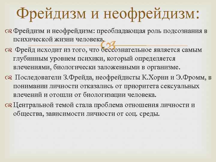 Фрейдизм и неофрейдизм: преобладающая роль подсознания в психической жизни человека. Фрейд исходит из того, что бессознательное является самым глубинным уровнем психики, который определяется влечениями, биологически заложенными в организме. Последователи З. Фрейда, неофрейдисты К. Хорни и Э. Фромм, в понимании личности отказались от приоритета сексуальных влечений и отошли от биологизации человека. Центральной темой стала проблема отношения личности и общества, зависимости личности от соц. среды.