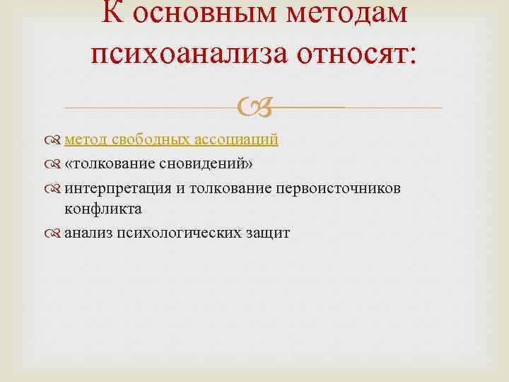 К основным методам психоанализа относят: метод свободных ассоциаций «толкование сновидений» интерпретация и толкование первоисточников конфликта анализ психологических защит