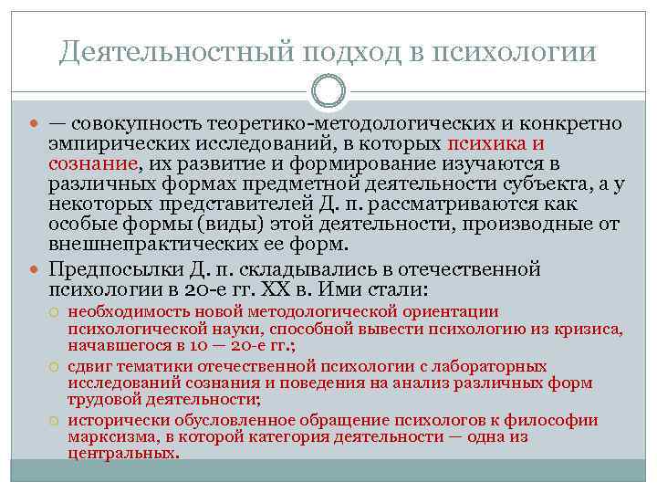 Деятельностный подход в психологии — совокупность теоретико-методологических и конкретно эмпирических исследований, в которых психика и сознание, их развитие и формирование изучаются в различных формах предметной деятельности субъекта, а у некоторых представителей Д. п. рассматриваются как особые формы (виды) этой деятельности, производные от внешнепрактических ее форм. Предпосылки Д. п. складывались в отечественной психологии в 20 -е гг. XX в. Ими стали: необходимость новой методологической ориентации психологической науки, способной вывести психологию из кризиса, начавшегося в 10 — 20 -е гг. ; сдвиг тематики отечественной психологии с лабораторных исследований сознания и поведения на анализ различных форм трудовой деятельности; исторически обусловленное обращение психологов к философии марксизма, в которой категория деятельности — одна из центральных.