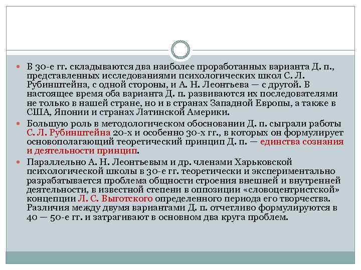 В 30 -е гг. складываются два наиболее проработанных варианта Д. п. , представленных исследованиями психологических школ С. Л. Рубинштейна, с одной стороны, и А. Н. Леонтьева — с другой. В настоящее время оба варианта Д. п. развиваются их последователями не только в нашей стране, но и в странах Западной Европы, а также в США, Японии и странах Латинской Америки. Большую роль в методологическом обосновании Д. п. сыграли работы С. Л. Рубинштейна 20 -х и особенно 30 -х гг. , в которых он формулирует основополагающий теоретический принцип Д. п. — единства сознания и деятельности принцип. Параллельно А. Н. Леонтьевым и др. членами Харьковской психологической школы в 30 -е гг. теоретически и экспериментально разрабатывается проблема общности строения внешней и внутренней деятельности, в известной степени в оппозиции «словоцентристской» концепции Л. С. Выготского определенного периода его творчества. Различия между двумя вариантами Д. п. отчетливо формулируются в 40 — 50 -е гг. и затрагивают в основном два круга проблем.