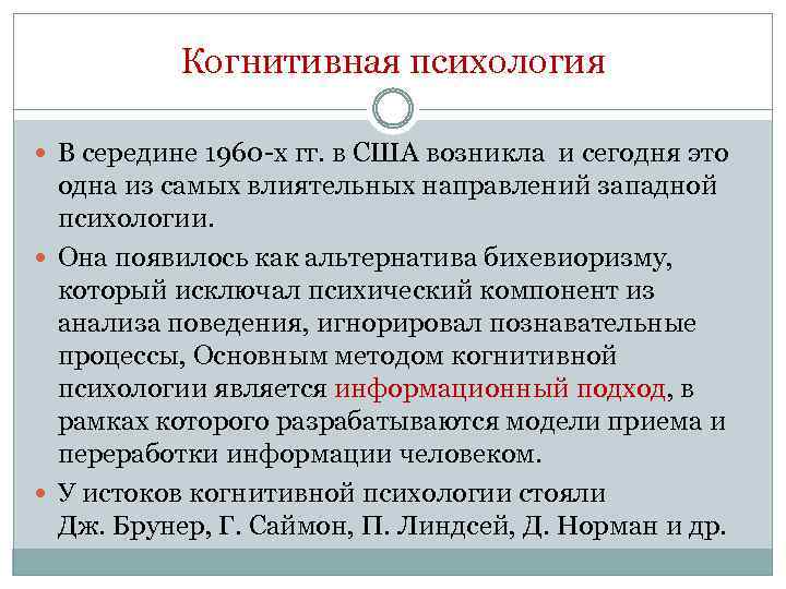 Когнитивная психология В середине 1960 -х гг. в США возникла и сегодня это одна из самых влиятельных направлений западной психологии. Она появилось как альтернатива бихевиоризму, который исключал психический компонент из анализа поведения, игнорировал познавательные процессы, Основным методом когнитивной психологии является информационный подход, в рамках которого разрабатываются модели приема и переработки информации человеком. У истоков когнитивной психологии стояли Дж. Брунер, Г. Саймон, П. Линдсей, Д. Норман и др.
