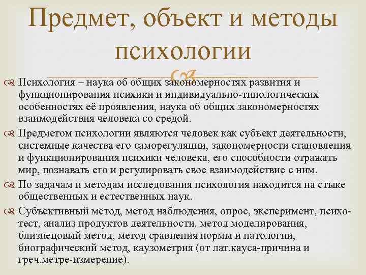 Предмет, объект и методы психологии Психология – наука об общих закономерностях развития и функционирования психики и индивидуально-типологических особенностях её проявления, наука об общих закономерностях взаимодействия человека со средой. Предметом психологии являются человек как субъект деятельности, системные качества его саморегуляции, закономерности становления и функционирования психики человека, его способности отражать мир, познавать его и регулировать свое взаимодействие с ним. По задачам и методам исследования психология находится на стыке общественных и естественных наук. Субъективный метод, метод наблюдения, опрос, эксперимент, психотест, анализ продуктов деятельности, метод моделирования, близнецовый метод, метод сравнения нормы и патологии, биографический метод, каузометрия (от лат. кауса-причина и греч. метре-измерение).