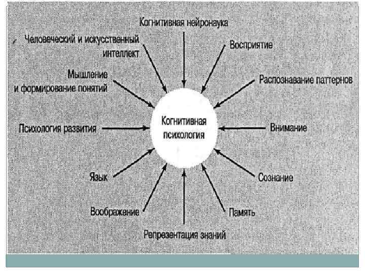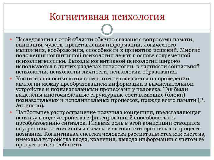 Когнитивная психология Исследования в этой области обычно связаны с вопросами памяти, внимания, чувств, представления информации, логического мышления, воображения, способности к принятию решений. Многие положения когнитивной психологии лежат в основе современной психолингвистики. Выводы когнитивной психологии широко используются в других разделах психологии, в частности социальной психологии, психологии личности, психологии образования. Когнитивная психология во многом основывается на проведении аналогии между преобразованием информации в вычислительном устройстве и познавательными процессами у человека. Так были выделены многочисленные структурные составляющие (блоки) познавательных и исполнительных процессов, прежде всего памяти (Р. Аткинсон). Наибольшее распространение получила концепция, представляющая психику в виде устройства с фиксированной способностью к преобразованию сигналов. Главная роль в этой концепции отводится внутренним когнитивным схемам и активности организма в процессе познания. Когнитивная система человека рассматривается как система, имеющая устройства ввода, хранения, вывода информации с учетом её пропускной способности.