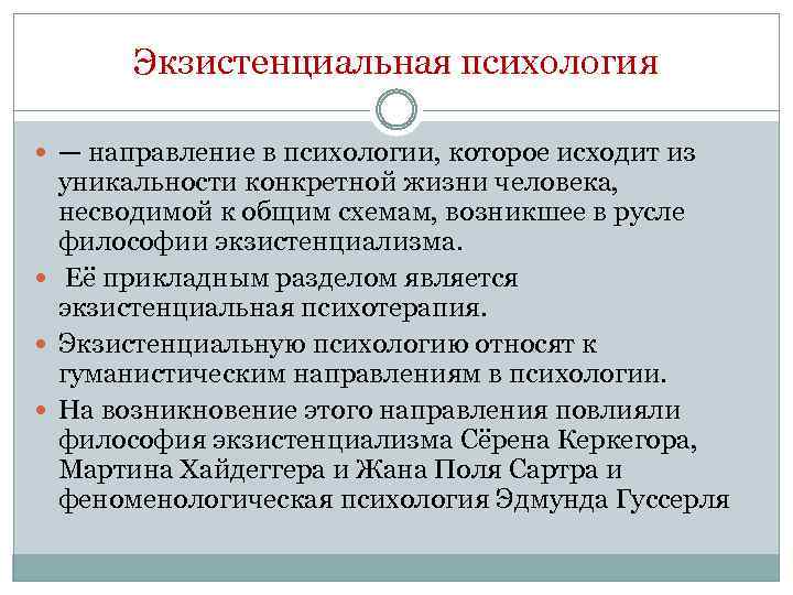 Экзистенциальная психология — направление в психологии, которое исходит из уникальности конкретной жизни человека, несводимой к общим схемам, возникшее в русле философии экзистенциализма. Её прикладным разделом является экзистенциальная психотерапия. Экзистенциальную психологию относят к гуманистическим направлениям в психологии. На возникновение этого направления повлияли философия экзистенциализма Сёрена Керкегора, Мартина Хайдеггера и Жана Поля Сартра и феноменологическая психология Эдмунда Гуссерля