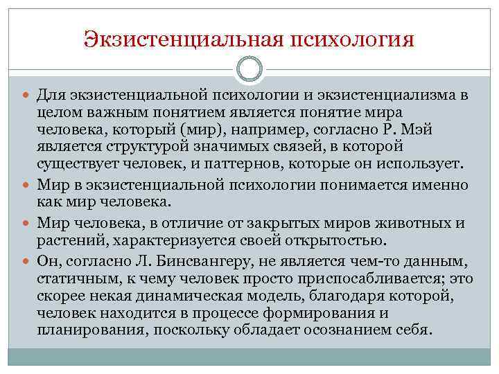 Экзистенциальная психология Для экзистенциальной психологии и экзистенциализма в целом важным понятием является понятие мира человека, который (мир), например, согласно Р. Мэй является структурой значимых связей, в которой существует человек, и паттернов, которые он использует. Мир в экзистенциальной психологии понимается именно как мир человека. Мир человека, в отличие от закрытых миров животных и растений, характеризуется своей открытостью. Он, согласно Л. Бинсвангеру, не является чем-то данным, статичным, к чему человек просто приспосабливается; это скорее некая динамическая модель, благодаря которой, человек находится в процессе формирования и планирования, поскольку обладает осознанием себя.