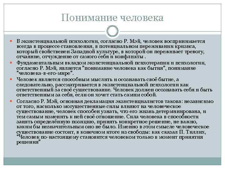 Понимание человека В экзистенциальной психологии, согласно Р. Мэй, человек воспринимается всегда в процессе становления, в потенциальном переживании кризиса, который свойственен Западной культуре, в которой он переживает тревогу, отчаяние, отчуждение от самого себя и конфликты. Фундаментальным вкладом экзистенциальной психотерапии и психологии, согласно Р. Мэй, является "понимание человека как бытия", понимание "человека-в-его-мире". Человек является способным мыслить и осознавать своё бытие, а следовательно, рассматривается в экзистенциальной психологии как ответственный за своё существование. Человек должен осознавать себя и быть ответственным за себя, если он хочет стать самим собой. Согласно Р. Мэй, основная декламация экзистенциалистов такова: независимо от того, насколько могущественные силы влияют на человеческое существование, человек способен узнать, что его жизнь детерминирована, и тем самым изменить к ней своё отношение. Сила человека в способности занять определённую позицию, принять конкретное решение, не важно, каким бы незначительным оно не было. Именно в этом смысле человеческое существование состоит, в конечном итоге из свободы: как сказал П. Тиллих, "Человек по-настоящему становится человеком только в момент принятия решения"
