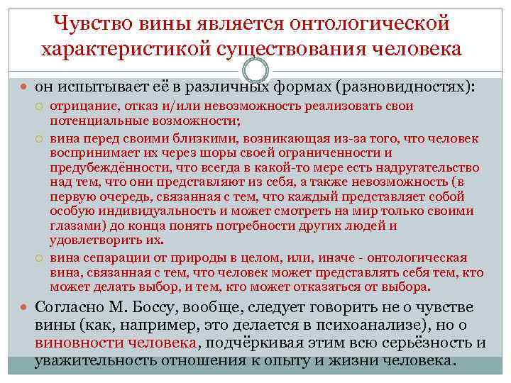 Чувство вины является онтологической характеристикой существования человека он испытывает её в различных формах (разновидностях): отрицание, отказ и/или невозможность реализовать свои потенциальные возможности; вина перед своими близкими, возникающая из-за того, что человек воспринимает их через шоры своей ограниченности и предубеждённости, что всегда в какой-то мере есть надругательство над тем, что они представляют из себя, а также невозможность (в первую очередь, связанная с тем, что каждый представляет собой особую индивидуальность и может смотреть на мир только своими глазами) до конца понять потребности других людей и удовлетворить их. вина сепарации от природы в целом, или, иначе - онтологическая вина, связанная с тем, что человек может представлять себя тем, кто может делать выбор, и тем, кто может отказаться от выбора. Согласно М. Боссу, вообще, следует говорить не о чувстве вины (как, например, это делается в психоанализе), но о виновности человека, подчёркивая этим всю серьёзность и уважительность отношения к опыту и жизни человека.