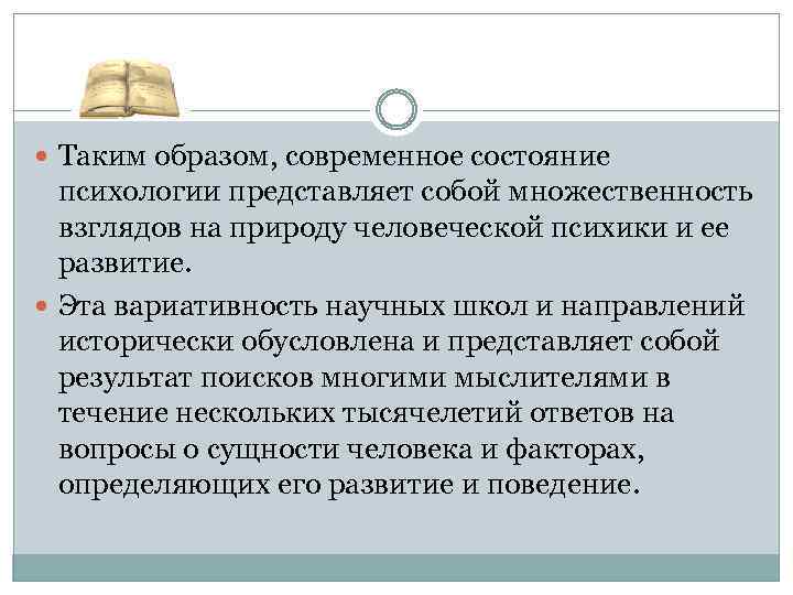 Таким образом, современное состояние психологии представляет собой множественность взглядов на природу человеческой психики и ее развитие. Эта вариативность научных школ и направлений исторически обусловлена и представляет собой результат поисков многими мыслителями в течение нескольких тысячелетий ответов на вопросы о сущности человека и факторах, определяющих его развитие и поведение.