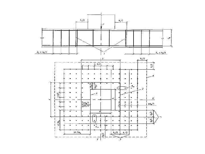 Конструктивные требования при поперечном армировании плит в зоне продавливания: • в направлении, перпендикулярном сторонам расчетного контура, устанавливают с шагом не более 1/3 h 0 и не более 300 мм. • стержни, ближайшие к контуру грузовой площади, располагают не ближе h 0/3 и не далее h 0/2 от этого контура. • при этом ширина зоны постановки поперечной арматуры (от контура грузовой площади) должна быть не менее 1/5 h 0.