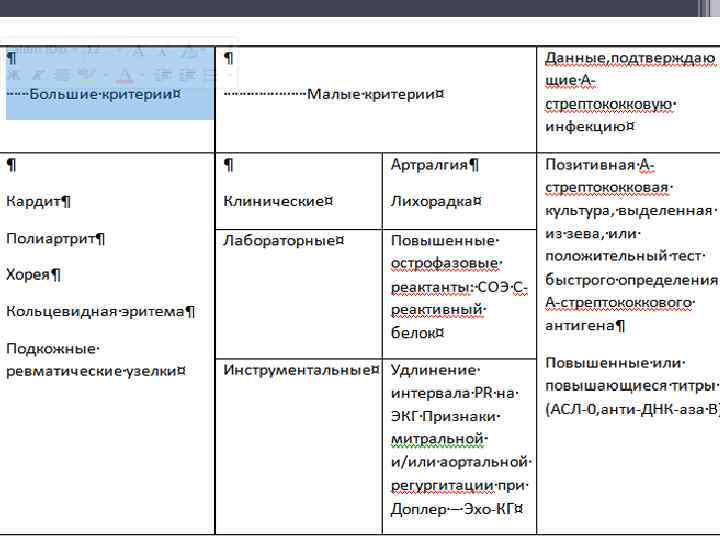 • Примечание: Наличие двух больших критериев или одного большого и двух малых в сочетании с данными, документировано подтверждающими предшествующую инфекцию стрептококками группы А, свидетельствует о высокой вероятности ОРЛ.
