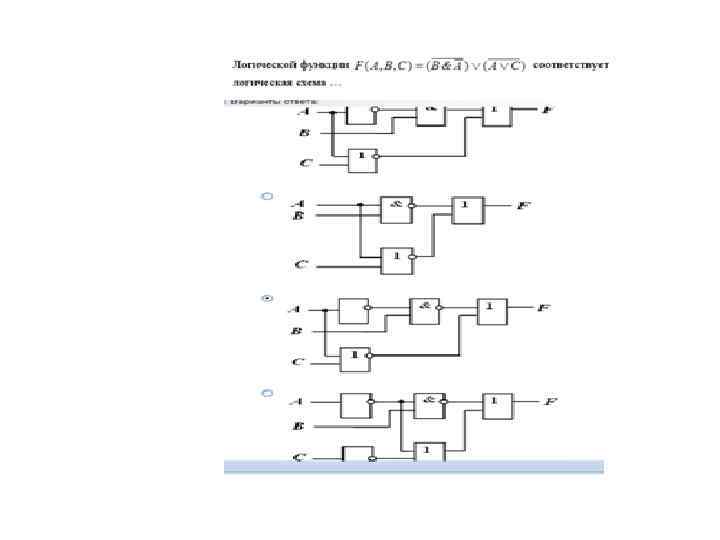 Пример • • Схема будет содержать 2 инвертора, 2 конъюнктора и 1 дизъюнктор. Построение надо начинать с логической операции, которая должна выполняться последней. В данном случае такой операцией является логическое сложение, следовательно, на выходе должен быть дизъюнктор. На него сигналы подаются с двух конъюнкторов, на которые, в свою очередь, подаются один входной сигнал нормальный и один инвертированный (с инверторов).