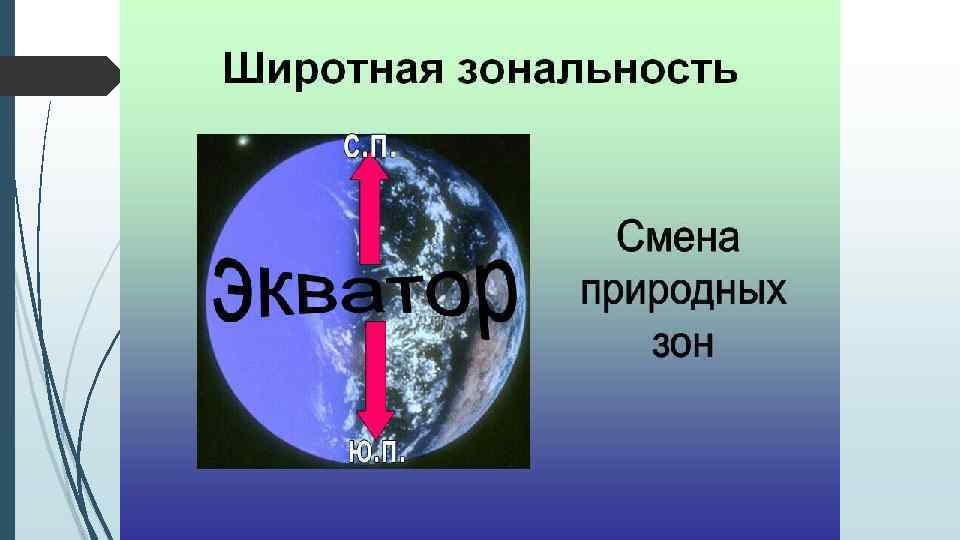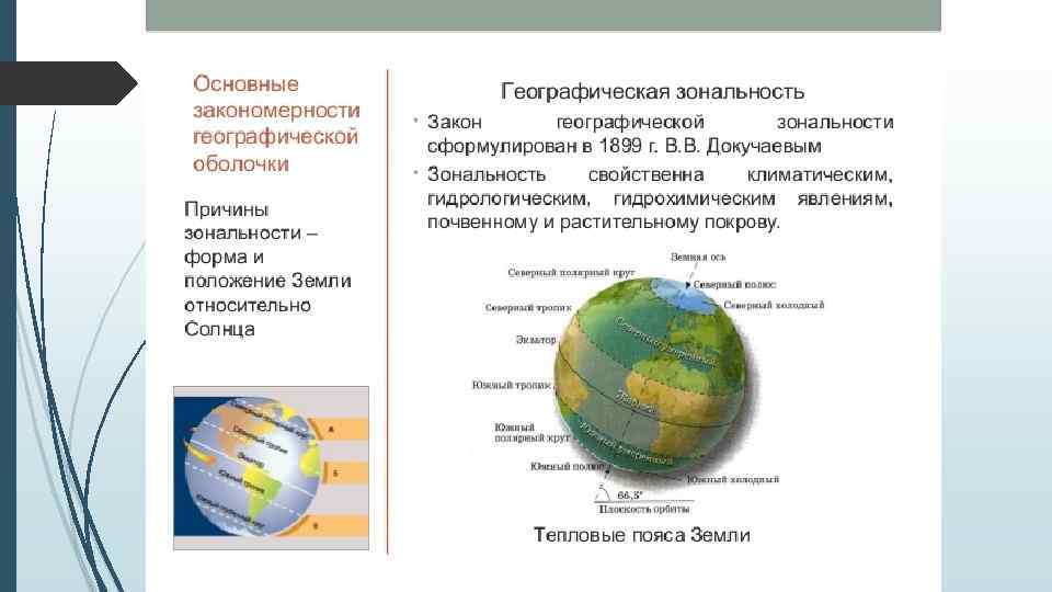 Зональность Изменение природных условий от полюсов к экватору, обусловленное широтными различиями в поступлении на поверхность Земли солнечной радиации. Макс. энергии получает поверхность, перпендикулярная солнечным лучам (экваториальные широты); чем больше наклон, тем меньше нагрев (полярные широты). Географическая зональность – одна из самых универсальных географических закономерностей, имеющая статус закона. В соответствии с этим законом ландшафтная оболочка Земли разделяется на природные зоны, повторяющиеся в Сев. и Юж. полушариях (напр. , зоны лесов и степей умеренного пояса, тропических пустынь и др. ).