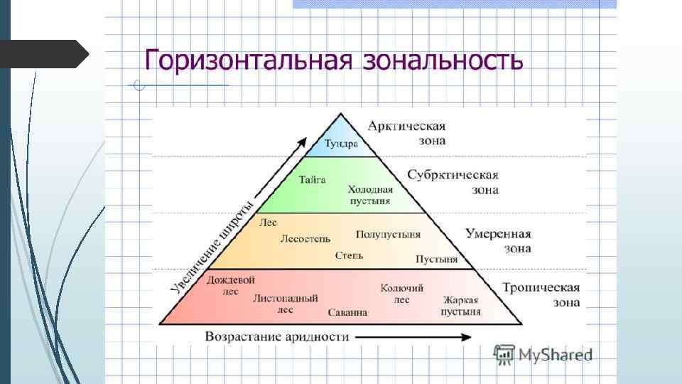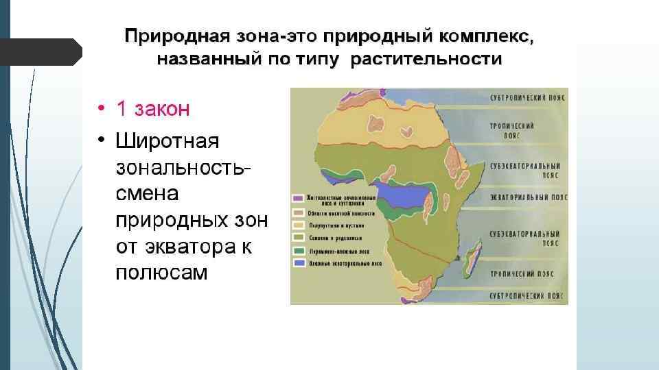 Природные зоны – основные, качественно различные подразделения географической оболочки, закономерно сменяющие друга в определенном порядке внутри географических поясов, главным образом, в зависимости, от количества тепла и влаги. Как правило, зоны занимают значительные площади и обладают вытянутыми очертаниями. В биологии их можно называть биоценозами, учитывая совокупность всех живых компонентов
