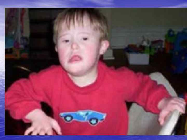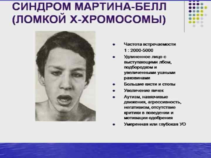 Клиническая картина Мальчики рождаются с большой массой тела — от 3, 5 до 4 кг. Имеются определённые фенотипические признаки: большая голова с высоким и широким лбом, длинное лицо с увеличенным подбородком, несколько уплощённая средняя часть лица, тупой, слегка клювовидно загнутый кончик носа. Уши большие, иногда оттопыренные, низко расположенные. Кисти и стопы широкие, дистальные фаланги пальцев также широкие, суставы имеют повышенную подвижность. Кожа нередко гиперэластична. Часто встречаются светлоокрашенные радужные оболочки, светлые волосы. Не обязательно встречаются все признаки — могут быть один или несколько. Неврологическая симптоматика неспецифична, определяется как и у всех детей с умственной отсталостью. Синдром ломкой Х-ромосомы является самой распространенной причиной умственной отсталости.
