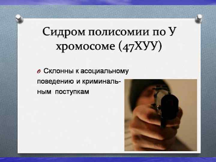 Хромосомное определение пола У человека: пол зависит от наличия Y-хромосомы (если она есть, проявляется фенотип самца, если нет — самки). Так, при мутациях, связанных с изменением числа половых хромосом, особи, имеющие в генотипе комбинации XY, XXY, XYY, XXYY и т. п. будут обладать мужским фенотипом различной степени выраженности, а имеющие комбинации XX, X, XXXX и т. п. — женским.