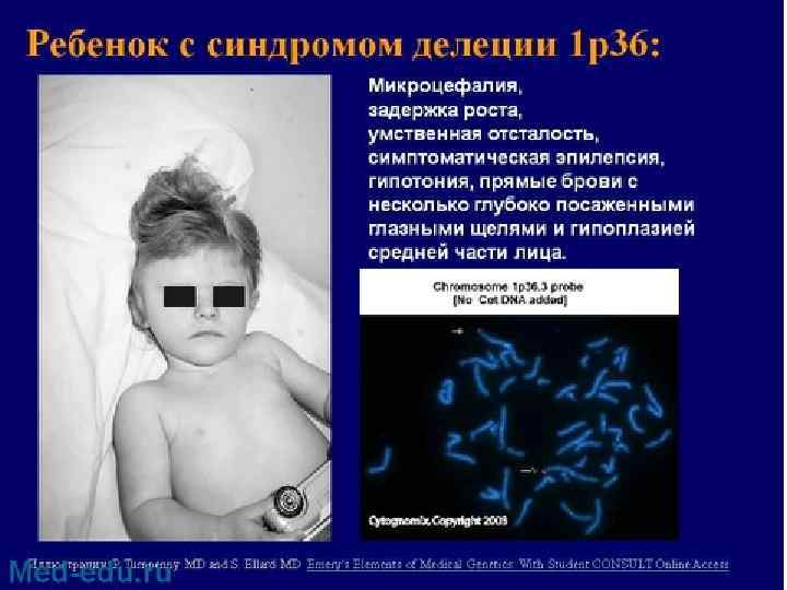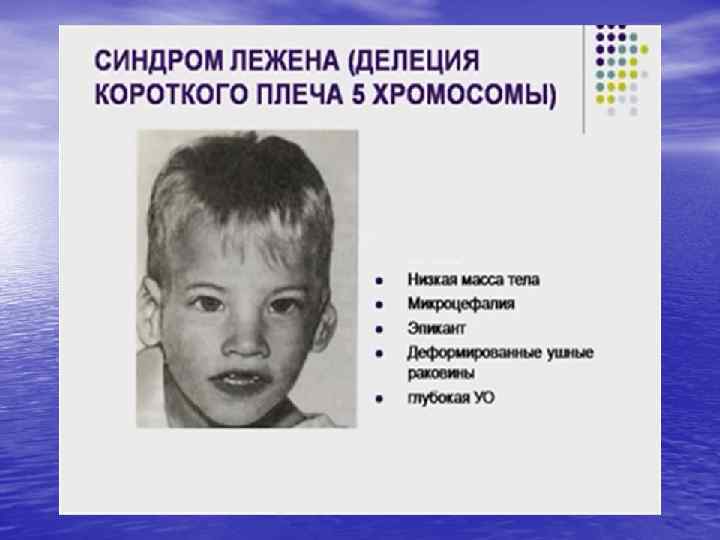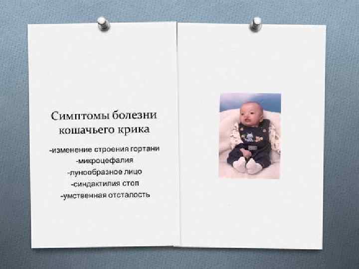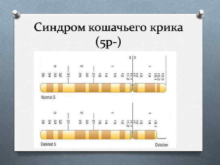 Синдром кошачьего крика • Хромосомно синдром кошачьего крика объясняется частичной моносомией; он развивается при делеции (с утратой от трети до половины, реже полная утрата) короткого плеча пятой хромосомы. Для развития клинической картины синдрома имеет значение не величина утраченного участка, а конкретный незначительный фрагмент хромосомы. Изредка отмечается мозаицизм по делеции или образование кольцевой хромосомы-5.