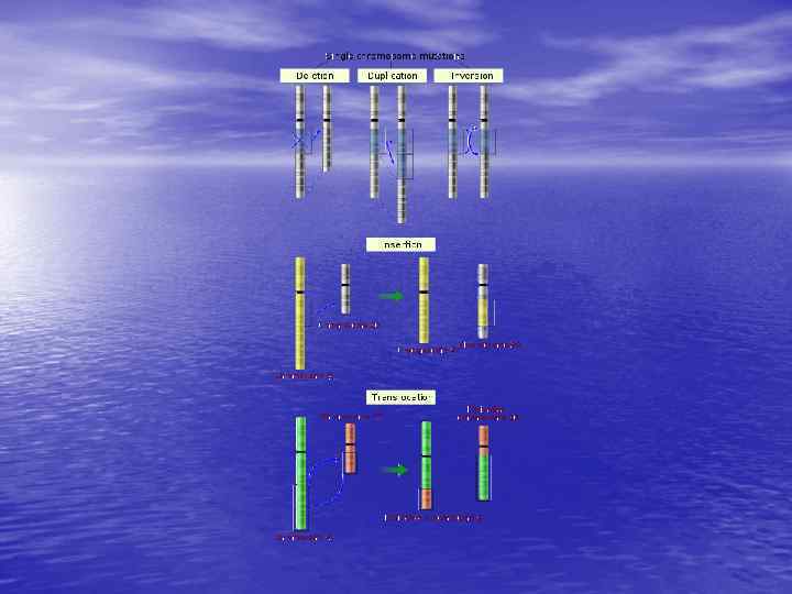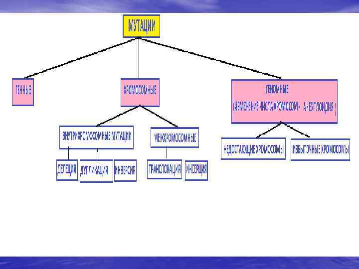 Различают несколько основных типов мутаций: • ГЕННЫЕ МУТАЦИИ , ПРИ КОТОРЫХ ИЗМЕНЕНИЯ ПРОИСХОДЯТ НА УРОВНЕ ОТДЕЛЬНЫХ ГЕНОВ, Т. Е. УЧАСТКОВ МОЛЕКУЛЫ ДНК • ХРОМОСОМНЫЕ , СВЯЗАНЫЕ С НАРУШЕНИЕМ СТРУКТУРЫ ХРОМОСОМ • ГЕНОМНЫЕ, СВЯЗАННЫЕ С ИЗМЕНЕНИЕМ ЧИСЛА ХРОМОСОМ