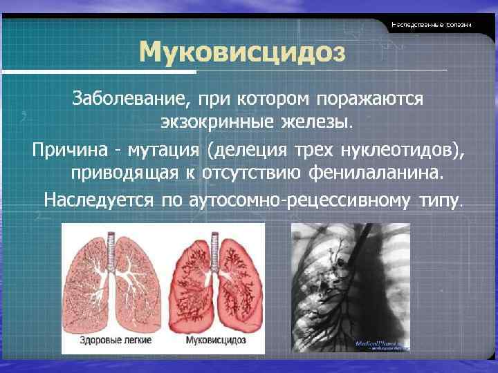 Тип наследования - аутосомно -рецемссивный Аутосомно-рецессивный тип наследования реализуется при наследственной передаче заболеваний, для клинической манифестации которых необходимо присутствие мутантного гена в гомозиготном состоянии, т. е. на обеих гомологичных хромосомах, унаследованных от родителей. Примеры: муковисцидоз, фенилкетонурия, гомоцистинурия