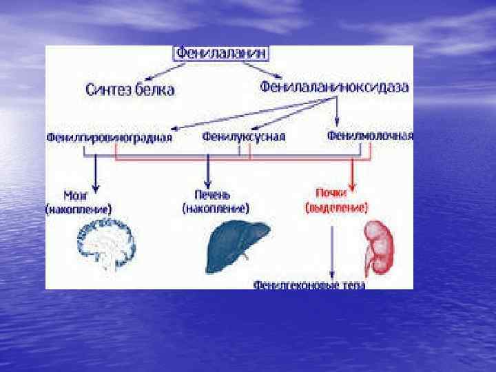 Фенилкетонурия. Наследуется по аутосомно-рецессивному типу. Обнаруживается у одного из 10000 новорожденных