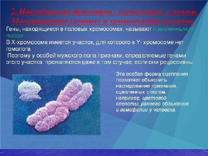 • Болезни, сцепленные с полом , в подавляющем большинстве случаев обусловлены мутациями генов на Ххромосоме , поскольку Y-хромосома несет небольшое число генов. С Yхромосомой сцеплены некоторые нарушения половой дифференцировки.