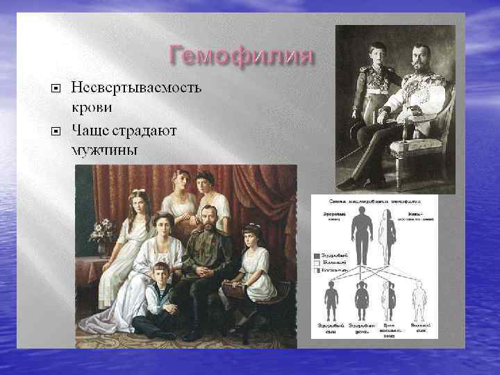 Болезни, сцепленные с X-хромосомой • Описано более 370 болезней, сцепленных (или предположительно сцепленных) с Х-хромосомой. Тяжесть заболевания зависит от пола. Полные формы болезни проявляются преимущественно у мужчин, поскольку они гемизиготны по генам, локализованным на Х-хромосоме. Если мутация затрагивает рецессивный сцепленный с Х-хромосомой ген ( XR-болезнь ), то гетерозиготные женщины здоровы, но являются носительницами гена (а гомозиготы в большинстве случаев летальны). Если мутация затрагивает доминантный сцепленный с Х-хромосомой ген ( XD-болезнь ), то у гетерозиготных женщин болезнь проявляется в легкой форме (а гомозиготы летальны). Важнейшее свойство болезней, сцепленных с Х-хромосомой , -невозможность их передачи от отца к сыну (поскольку сын наследует Y-, а не Х-хромосому отца).