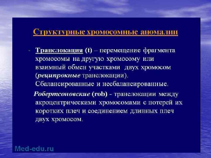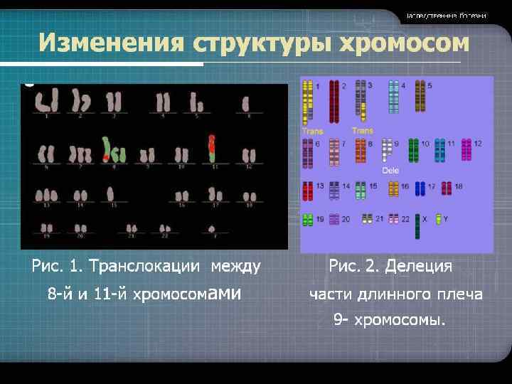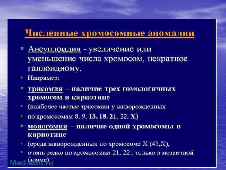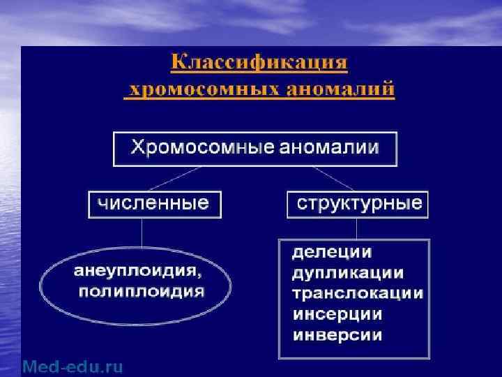 Хромосомные болезни (продолжение) В основе классификации хромосомных болезней лежат типы мутаций. • Выделяют числовые и структурные хромосомные мутации. • Числовые изменения сводятся к наличию добавочных хромосом или отсутствию одной из хромосом. • Структурные хромосомные мутации разделятся на внутрихромосомные и межхромосомные.