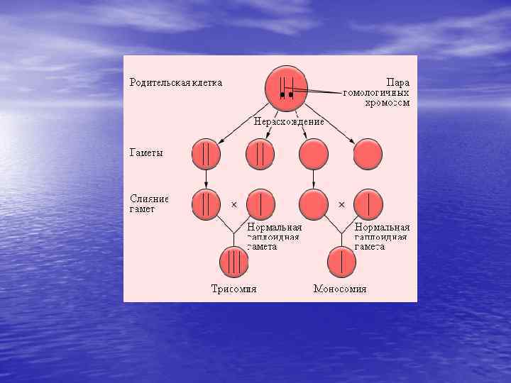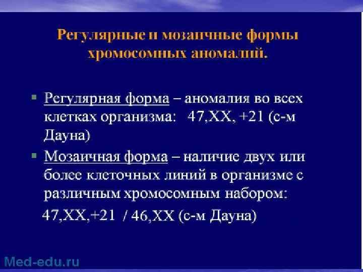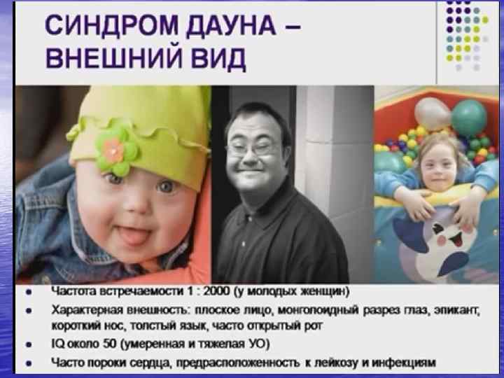 Хромосомные болезни • К хромосомным болезням относят такие • формы патологии, при которых наблюдаются, как правило, нарушения психики и множественные врожденные пороки различных систем организма человека. Большинство хромосомных болезней возникает спорадически в результате геномной и хромосомной мутаций в гаметах здоровых родителей или на первых делениях зиготы.