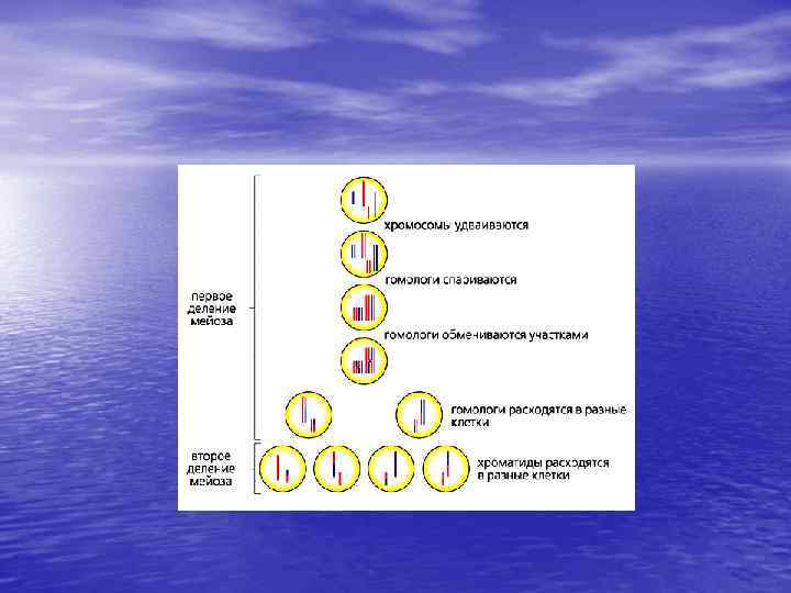 Мейоз • МЕЙОЗ– (от греч. Meiosis – уменьшение)– форма ядерного • • деления, сопровождающаяся уменьшением числа хромосом с диплойдного ( 2 n ) до гаплойдного ( n ). Мейоз происходит при образовании сперматозойдов и яйцеклеток у животных (гаметогенез). ЗНАЧЕНИЕ МЕЙОЗА— у организмов, размножающихся половым путем, образуется четыре половые клетки, каждая из которых гаплойдна. При оплодотворении ядра гамет сливаются, образуя зиготу, которая содержит постоянное (диплоидное) для каждого вида число хромосом. Кроме того, в результате мейоза создаются множество генных комбинаций, что ведет к изменениям в генотипе и фенотипе потомства.