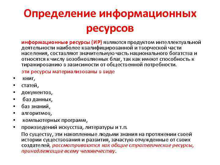 Определение информационных ресурсов • • информационные ресурсы (ИР) являются продуктом интеллектуальной деятельности наиболее квалифицированной и творческой части населения, составляют значительную часть национального богатства и относятся к числу возобновляемых благ, так как имеют способность к тиражированию в зависимости от общественной потребности. эти ресурсы материализованы в виде книг, статей, документов, баз данных, баз знаний, алгоритмов, компьютерных программ, произведений искусства, литературы и т. п. По существу, эти накопленные людьми знания на протяжении своей истории существования и развития, зачастую отчужденные от своих создателей, рассматриваются как общие стратегические ресурсы, принадлежащие всему человечеству.