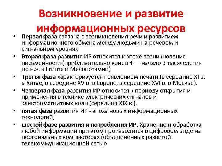 Возникновение и развитие информационных ресурсов • Первая фаза связана с возникновения речи и развитием информационного обмена между людьми на речевом и сигнальном уровнях • Вторая фаза развития ИР относится к эпохе возникновения письменности (приблизительно конец 4 — начало 3 тысячелетия до н. э. в Египте и Месопотамии) • Третъя фаза характеризуется появлением печати (в середине ХI в. в Китае, в середине XV в. в Европе, в середине XVI в. в Москве). • Четвертая фаза развития ИР относится к периоду открытия и применения в технике электрических сигналов и электромагнитных волн (середина XIX в. ). • пятая фаза развития ИР - эпоха новых информационных технологий, • шестой фазе развития и потребления ИР. Хранение и обработка любой информации при этом производится в цифровом виде на персональных компьютерах (объединенных развитой телекоммуникационной сетью