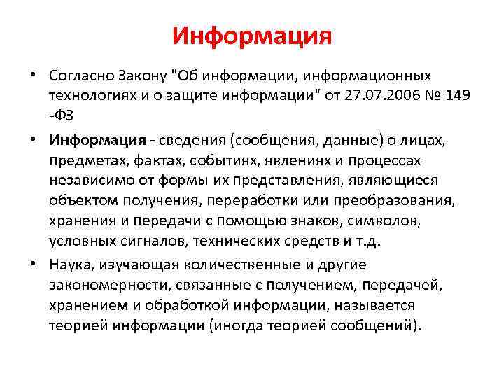 Информация • Согласно Закону "Об информации, информационных технологиях и о защите информации" от 27. 07. 2006 № 149 -ФЗ • Информация - сведения (сообщения, данные) о лицах, предметах, фактах, событиях, явлениях и процессах независимо от формы их представления, являющиеся объектом получения, переработки или преобразования, хранения и передачи с помощью знаков, символов, условных сигналов, технических средств и т. д. • Наука, изучающая количественные и другие закономерности, связанные с получением, передачей, хранением и обработкой информации, называется теорией информации (иногда теорией сообщений).