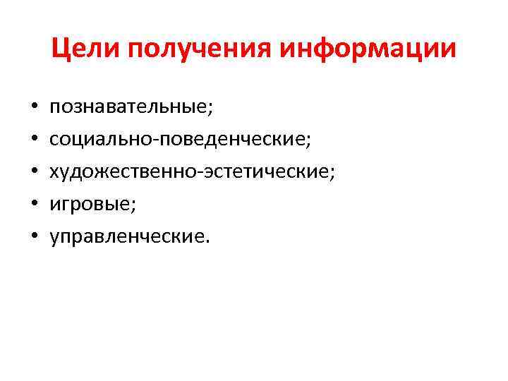 Цели получения информации • • • познавательные; социально-поведенческие; художественно-эстетические; игровые; управленческие.