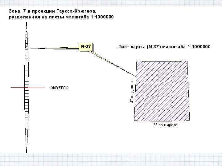 Проекция Гаусса-Крюгера • В проекции Гаусса-Крюгера вся поверхность Земли условно разделена на 60 зон меридианами, проведенными через 6 градусов; форма зоны - сферический двуугольник; • счет зон ведется от Гринвичского меридиана на восток. Средний меридиан зоны называется осевым; долгота осевого меридиана (L 0 ) любой зоны в восточном полушарии подсчитывается по формуле: L 0=6 ° *n-3 °, а в западном - по формуле: L 0=360°-(6 ° *n-3 °), где n - номер зоны.